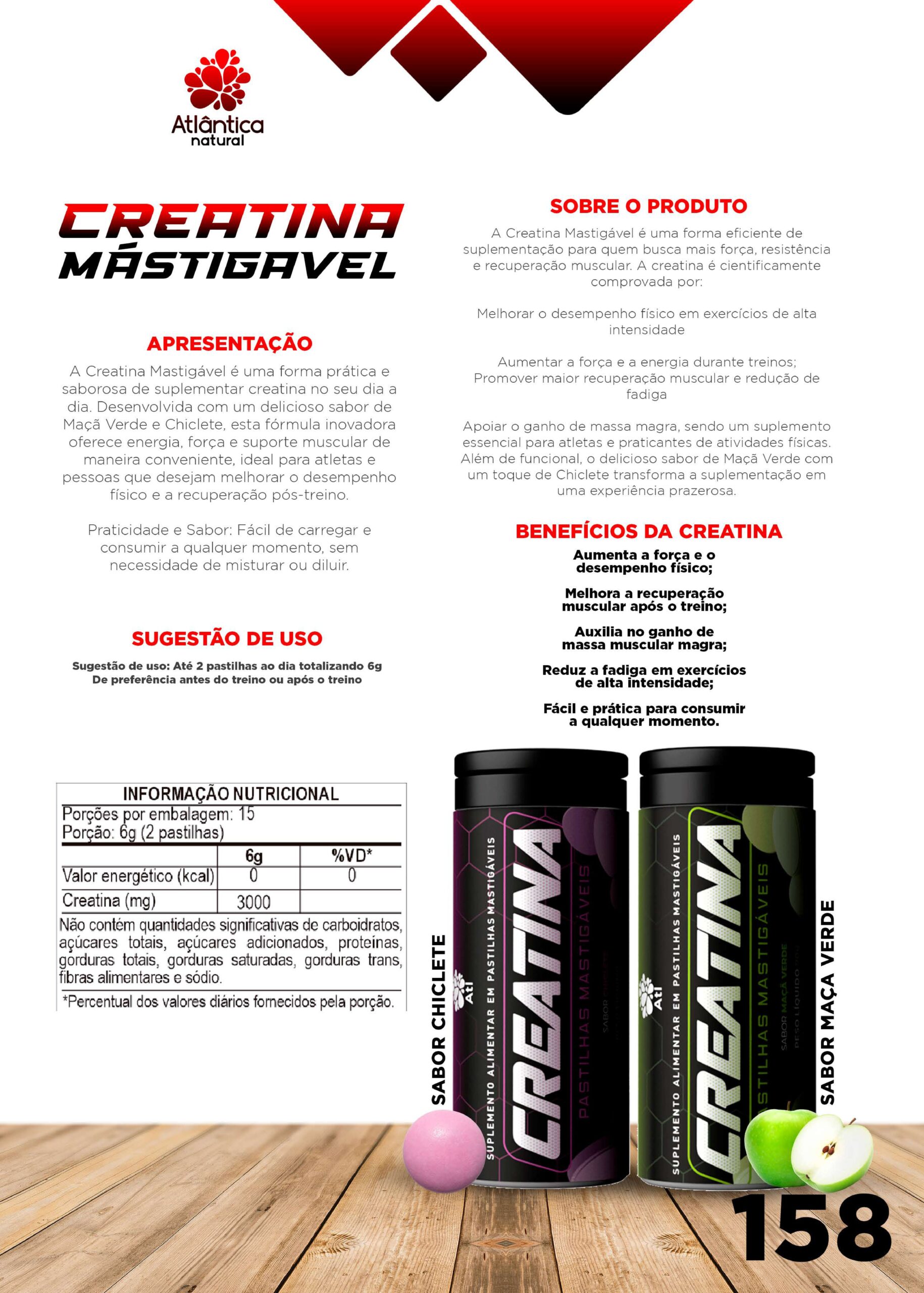 A Creatina Mastigável é uma forma prática e saborosa de suplementar creatina no seu dia a dia. Desenvolvida com um delicioso sabor de Maçã verde e chiclete, esta fórmula inovadora oferece energia, força e suporte muscular de maneira conveniente, ideal para atletas e pessoas que desejam melhorar o desempenho físico e a recuperação pós-treino.
