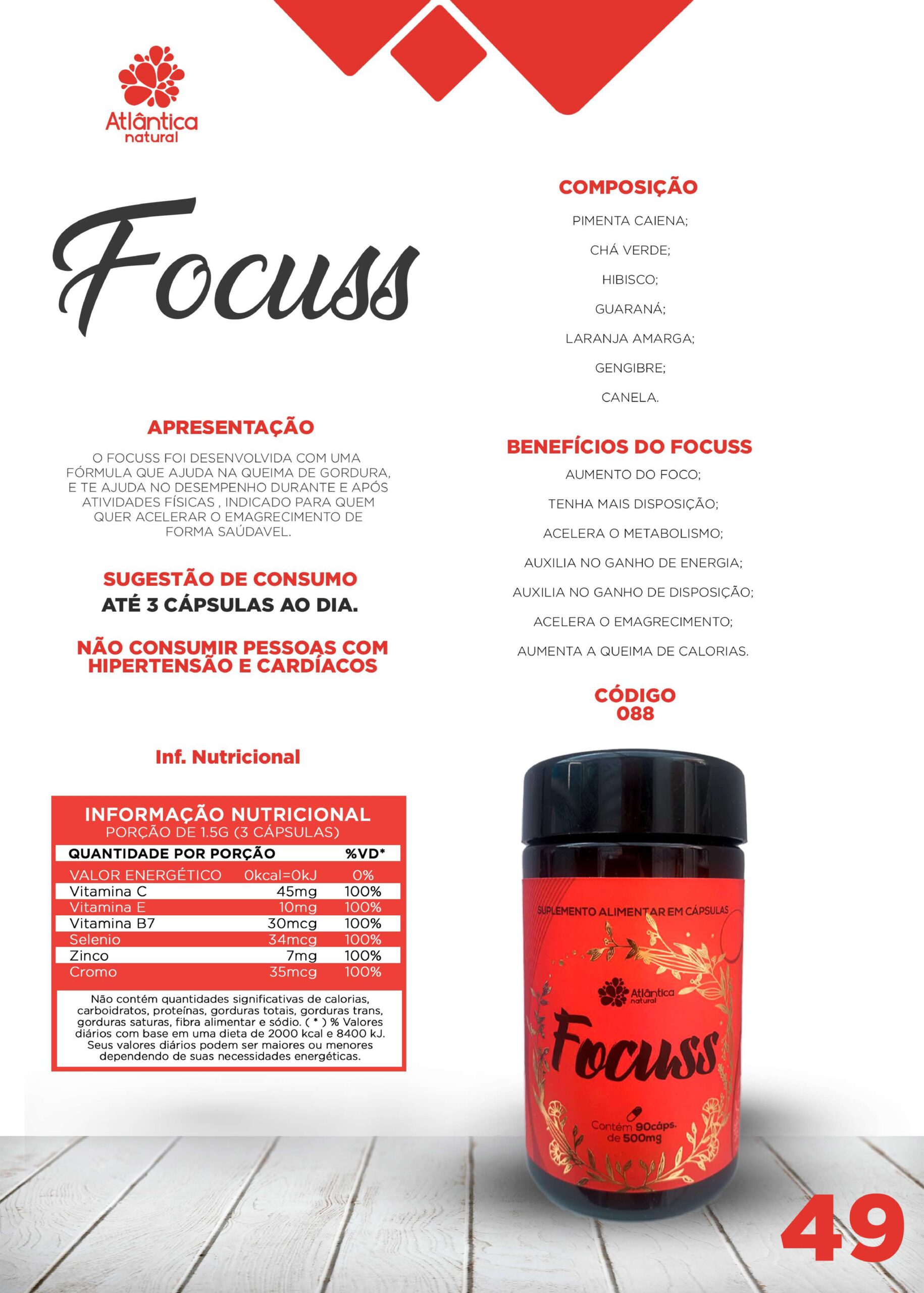 O Focuss é um comprimido com compostos naturais como a Cafeína, a Vitamina B6 e a Colina* que ajudam a fortalecer o sistema cognitivo, responsável pelo foco, capacidade de memorização, concentração rápida ou prolongada, e pela energia do corpo. Ele pode ser usado por qualquer pessoa acima dos 19 anos que deseja levar a mente e o foco a um nível superior, permitindo horas de concentração no trabalho, estudo ou qualquer atividade que exija o uso cerebral. Os benefícios do Focuss são percebidos principalmente por pessoas que mantém uma alimentação saudável e possuem uma rotina de exercícios já que são essenciais para o máximo desempenho do cérebro.