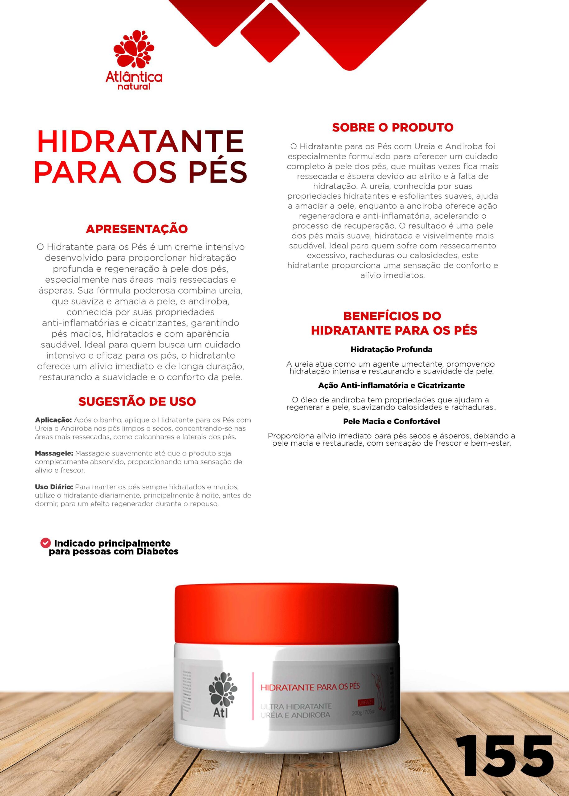 Sua fórmula poderosa combina ureia, que suaviza e amacia a pele, e andiroba, conhecida por suas propriedades anti-inflamatórias e cicatrizantes, garantindo pés macios, hidratados e com aparência saudável.