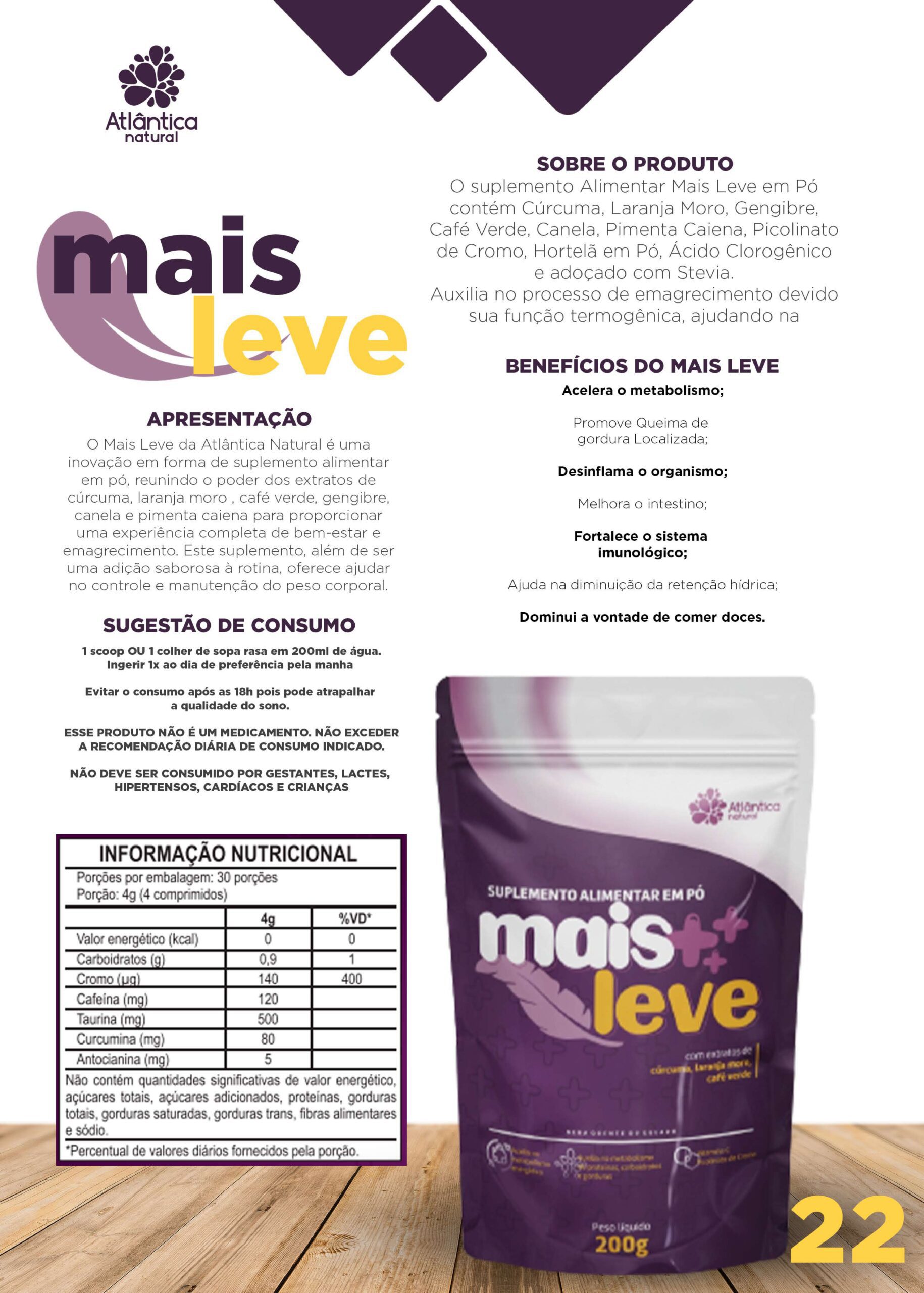O Mais Leve da Atlântica Natural é uma inovação em forma de suplemento alimentar em pó, reunindo o poder dos extratos de cúrcuma, laranja moro, café verde, gengibre, canela e pimenta caiena para proporcionar uma experiência completa de bem-estar e emagrecimento. Este suplemento, além de ser uma adição saborosa à rotina, oferece ajudar no controle e manutenção do peso corporal.