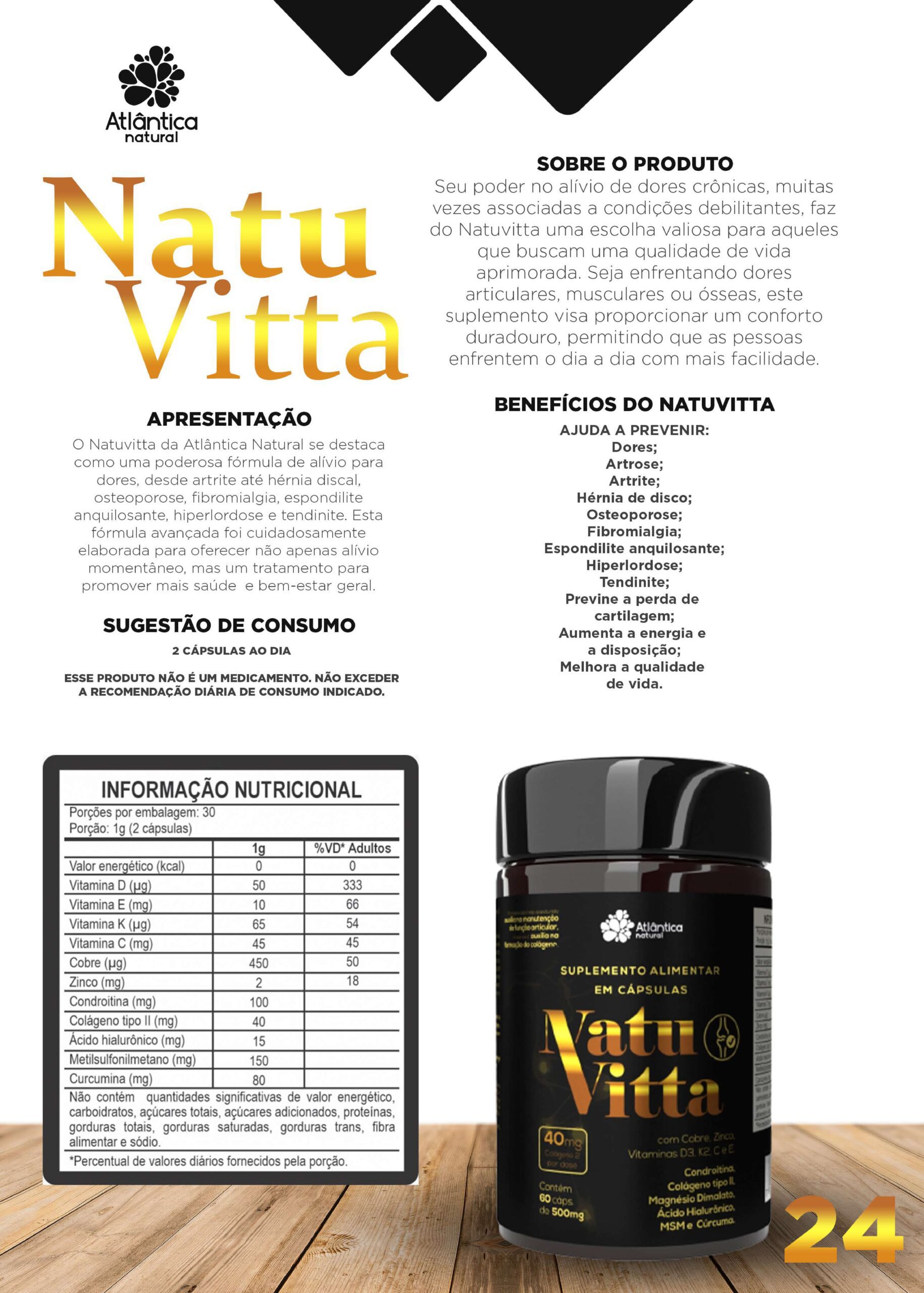 O NatuVitta da Atlântica Natural se destaca como uma poderosa fórmula de alívio para dores, desde artrite até hérnia discal, osteoporose, fibromialgia, espondilite anquilosante, hiperlordose e tendinite. Esta fórmula avançada foi cuidadosamente elaborada para oferecer não apenas alívio momentâneo, mas um tratamento para promover mais saúde e bem-estar geral.