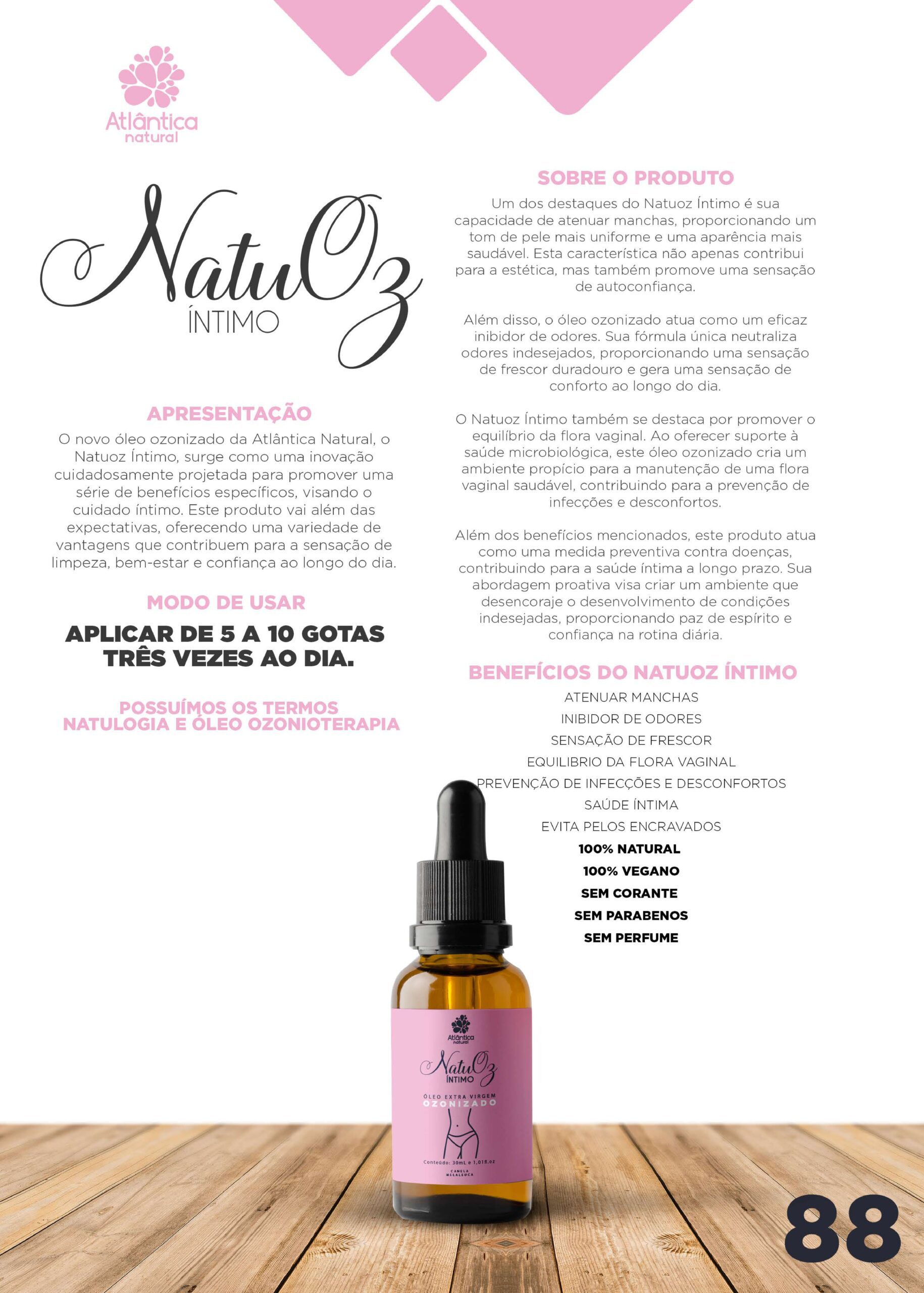 O novo óleo ozonizado da Atlântica Natural, o Natuz Íntimo, surge como uma inovação cuidadosamente projetada para promover uma série de benefícios específicos, visando o cuidado íntimo. Este produto vai além das expectativas, oferecendo uma variedade de vantagens que contribuem para a sensação de limpeza, bem-estar e confiança ao longo do dia.